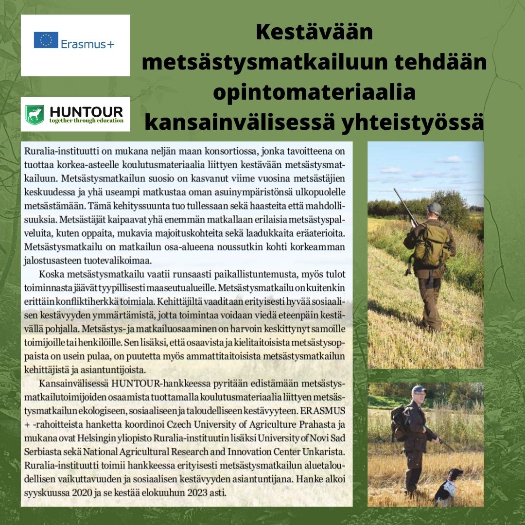 The international HUNTOUR project aims to improve the level of expertise and skills in hunting tourism by creating educational materials to promote its ecological, social, and economic sustainability. The project, funded by ERASMUS+, is coordinated by the Czech University of Life Sciences Prague. Alongside the Ruralia Institute at Helsinki University, other participants include the University of Novi Sad in Serbia and the University of Sopron in Hungary. Within the project, the Ruralia Institute serves primarily as an expert on social sustainability and the effectiveness of regional economies. The project started in September 2020 and will run until August 2023.